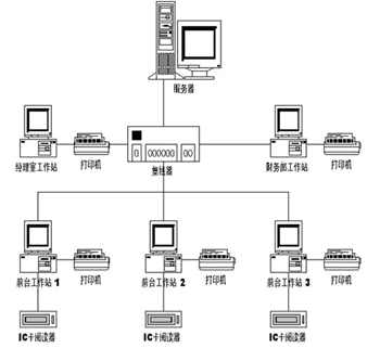 系統(tǒng)由IC卡閱讀器、工作站、服務(wù)器、打印機(jī)、相應(yīng)網(wǎng)絡(luò)及管理軟件組成。由工作站接收IC卡閱讀器的客戶數(shù)據(jù)并輸入消費業(yè)務(wù)數(shù)據(jù),通過網(wǎng)絡(luò)保存到服務(wù)器。