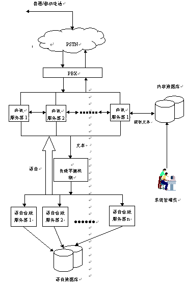 當(dāng)用戶通過電話向聲訊服務(wù)器發(fā)出請求時,聲訊服務(wù)器會首先作出分析判斷,然后從內(nèi)容數(shù)據(jù)庫中提取相應(yīng)的文本信息,經(jīng)過負(fù)載平衡機制發(fā)送給語音合成服務(wù)器。語音合成服務(wù)器在接收到文本后立刻開始合成,同時將合成好的語音發(fā)送回語音服務(wù)器,再由語音服務(wù)器回傳給用戶。其中內(nèi)容數(shù)據(jù)庫中的信息可以由系統(tǒng)管理員定期進行維護管理。(系統(tǒng)連接結(jié)構(gòu)見流程圖)