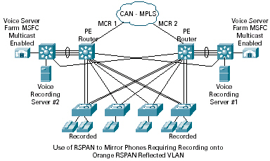 在第三層,所有語音(電話)接入VLAN都在語音服務(wù)器群第三層交換機上端接,以確保電話到網(wǎng)關(guān)和Call Manager的流量脫離PE路由器。這還可以建立一個終端組播區(qū),因為在部署GTAA項目時,Cisco Catalyst 6500 MPLS網(wǎng)絡(luò)還不支持組播。