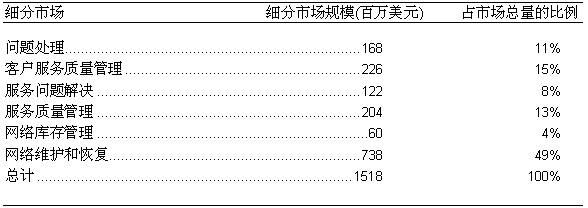如圖二所示, 2000年, 在美國的固定網(wǎng)OSS服務(wù)保障市場的六個(gè)細(xì)分市場中, 規(guī)模最大的是網(wǎng)絡(luò)維護(hù)和恢復(fù)市場, 市場總額約為7.38億美元, 占整個(gè)市場的49%; 而規(guī)模最小的是網(wǎng)絡(luò)庫存管理市場, 市場總額約為6千萬美元, 僅占整個(gè)市場的4%左右。