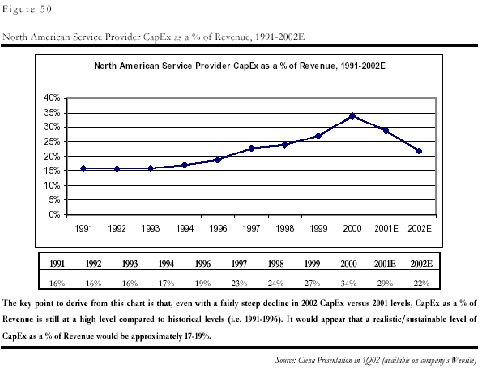 和中國(guó)的問(wèn)題一樣,制造商的問(wèn)題是電信服務(wù)企業(yè),即運(yùn)營(yíng)商的投入減少造成的。由于上世紀(jì)末互聯(lián)網(wǎng)和電子商務(wù)泡沫的虛假繁榮的影響,各運(yùn)營(yíng)商都嚴(yán)重高估了市場(chǎng)需求,認(rèn)為需求是會(huì)隨著通信能力的增強(qiáng)無(wú)限增加,因此市場(chǎng)規(guī)模是會(huì)無(wú)限擴(kuò)張的,他們?cè)谌狈?duì)最終用戶(hù)需求的深入分析的前提下,普遍在基礎(chǔ)設(shè)施的建設(shè)上進(jìn)行了超大規(guī)模的投入,其基礎(chǔ)設(shè)施建設(shè)投入在收入中的比例一度在2000年從平均的15%達(dá)到了創(chuàng)記錄的35%。