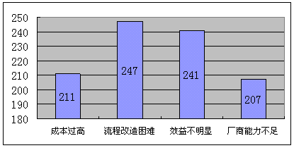 b)流程改造困難,對這個困難的擔(dān)心的企業(yè)數(shù)量最多,考慮到國內(nèi)企業(yè)的現(xiàn)實管理問題,流程改造必然與現(xiàn)實的利益發(fā)生矛盾,引起的阻力不可輕視。