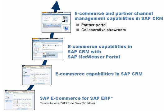 從上圖中,我們可以清楚地看出SAP的電子商務(E-Commerce)功能經(jīng)歷了一個不斷進化的過程。主要分成以下四個階段: