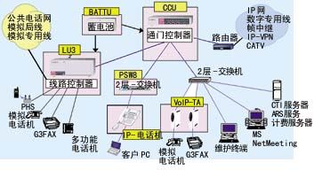 圖1顯示了一個IPstage系統(tǒng)的基本結(jié)構,IP PBX系統(tǒng)包含了通信控制器(CCU)、線路控制器(LU32)、以太網(wǎng)電話IP-TEL、連接普通電話的VoIP-TA適配器、后備電池,以及可直接連接PHS基站系統(tǒng)。通信控制器是IP PBX的核心部分,它可以配置電話的分機號碼、功能按鈕以及通話管理和路由策略;線路控制器用來實現(xiàn)IP網(wǎng)絡和傳統(tǒng)電路交換電話網(wǎng)的通信,完成異種網(wǎng)絡的電話呼入和呼出,;VoIP-TA適配器用來為傳統(tǒng)的模擬電話和傳真機服務,PHS基站系統(tǒng)可實現(xiàn)無線市話功能。在網(wǎng)絡中的H.323客戶端(如NetMeeting用戶)同樣可以和其它電話進行通話。