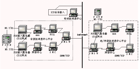 全國短消息統(tǒng)一平臺(tái)是在省局短消息中心上架構(gòu),各省局下設(shè)地/市局短消息中心。各地短消息中心通過INTERNET連接,交互信息,ICP業(yè)務(wù)商和其他業(yè)務(wù)平臺(tái)也通過INTERNET接入短消息系統(tǒng)。根據(jù)《基于電話網(wǎng)的信息終端及綜合平臺(tái)技術(shù)規(guī)范》中的CTSI (Chinese Terminal Service Interface)協(xié)議,短消息系統(tǒng)系統(tǒng)結(jié)構(gòu)可如下圖所示: