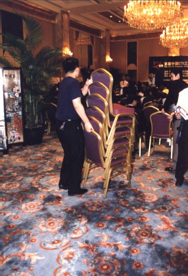 大會(huì)工作人員正在為來賓臨時(shí)增加椅子