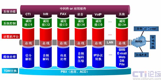傳統(tǒng)的媒體處理模塊都工作在計算機總線上,而新架構(gòu)的通用媒體處理模塊則工作在通用的、標(biāo)準(zhǔn)的TCP/IP網(wǎng)絡(luò)上,一方面增加了系統(tǒng)帶寬,提高了媒體處理效率,另一方面實現(xiàn)了呼叫中心的分布式運營、跨網(wǎng)運營以及負(fù)擔(dān)均衡。