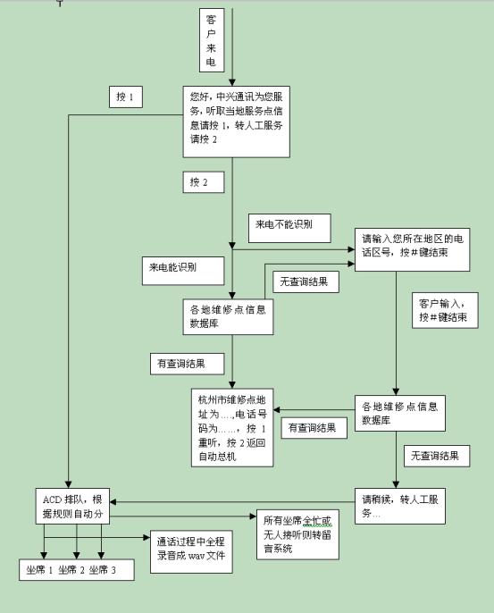 在中興通訊呼叫中心流程設(shè)計(jì)上充分體現(xiàn)了CTI技術(shù)以及數(shù)據(jù)庫技術(shù)等IT技術(shù)與星際先進(jìn)的管理理念的融合。該流程的設(shè)計(jì)保證將主動(dòng)提高服務(wù)品質(zhì)的工作集中于對呼叫者最重要的環(huán)節(jié)――對維修網(wǎng)點(diǎn)信息的咨詢上。它為所有呼叫者提供了詳細(xì)、精煉、基本的高品質(zhì)電話服務(wù),同時(shí)又根據(jù)電話區(qū)號提供了有針對性的咨詢服務(wù)。