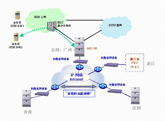 為降低通信成本,提高辦公效率,愛立信及其合作伙伴利用客戶原有數(shù)據(jù)專網(wǎng),擴(kuò)充帶寬,用2M 專線將其14個分支機構(gòu)和廣州黃埔總部連接起來,并用語音交換機替換原直線電話,使該2M的寬帶同時傳輸數(shù)據(jù)和語音(構(gòu)建公司內(nèi)部VPN),形成了公司的VoIP專網(wǎng). 同時,在公司總部, 用愛立信MD110替換原有交換機,并與廣東移動直接相連,總部配180個設(shè)定不同的權(quán)限級別的ME(移動分機),使經(jīng)常在外辦理業(yè)務(wù)的人員的手機號被注冊為總部交換機的一個移動分機。廣東移動為所有移動分機提供特殊價格。