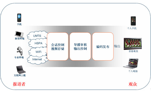 如今手機(jī)能拍照、攝像并不稀奇,攝像頭幾乎成了手機(jī)的標(biāo)準(zhǔn)配置,視頻通話也是3G特色業(yè)務(wù)之一,但要把手機(jī)拍攝的圖像實(shí)時(shí)回傳到電視臺(tái),并合理地發(fā)送到直播節(jié)目中卻還需要打通很多環(huán)節(jié)?偟膩(lái)說(shuō),電視臺(tái)需要的是一個(gè)業(yè)務(wù)控制平臺(tái),使后臺(tái)導(dǎo)播人員能監(jiān)控、審核手機(jī)回傳的多路視頻信號(hào),根據(jù)需要選取其中的合適內(nèi)容插入到直播節(jié)目中,同時(shí)系統(tǒng)還應(yīng)該能夠根據(jù)需求同時(shí)輸出各種格式的視頻,發(fā)布到電視頻道、互聯(lián)網(wǎng)或者手機(jī)電視中。