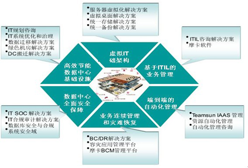 圍繞云計(jì)算數(shù)據(jù)中心的建設(shè),華勝天成共開發(fā)了多個(gè)解決方案,且每個(gè)解決方案均有專業(yè)的售前支持團(tuán)隊(duì)和售后實(shí)施團(tuán)隊(duì),這些解決方案不是分散而無關(guān)的,而是針對用戶的不同情況,在各方面均給予綜合考慮,以最優(yōu)的設(shè)計(jì)方案來滿足用戶的需要,并兼顧另外方面的后繼需求。