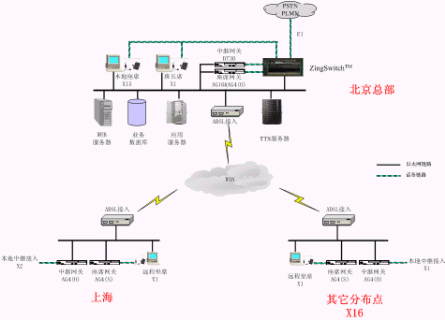 系統(tǒng)在北京總部部署了一套英立訊的ZingSwitch一體化交換機(jī),采用高度集成的ALL-IN-ONE方式提供了PABX、ACD、CTI Server、IVR Server、實時錄音等功能,同時配置了FAX/TTS服務(wù)器,用于提供與呼叫平臺集成的傳真/文本轉(zhuǎn)語音等功能。系統(tǒng)只在北京總部安裝了一套一體化呼叫中心,其他各分布點只設(shè)立坐席和中繼。這樣既能保證業(yè)務(wù)的正常運行還為企業(yè)大大的降低成本。英立訊科技為正普科技提供的基于VoIP分布式呼叫中心解決方案在業(yè)內(nèi)也是一個新的典范,對于分支機(jī)構(gòu)多而每個分支機(jī)構(gòu)座席少量的情況提出了這種極具實用性和擴(kuò)展性的解決方案,真正從用戶角度出發(fā),為用戶量身打造全業(yè)務(wù)、高性價比的呼叫中心。