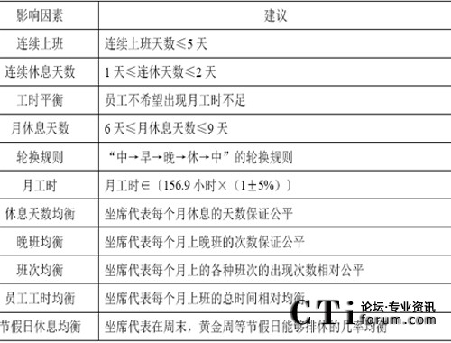 要滿足每半小時實際安排的座席數(shù)量不少于需要的座席數(shù)量的要求,首先就需要進行班次的設(shè)計,這是為第五環(huán)節(jié)資源規(guī)劃而準(zhǔn)備的!鞍啻卧O(shè)計”是指設(shè)計出一系列的班次,比如早班,中班,晚班,等等。而將來只要告訴員工,你下個月每天各上什么樣的班次即可。在班次設(shè)計時,需要充分考慮前面提到的一些影響因素:如下所示。