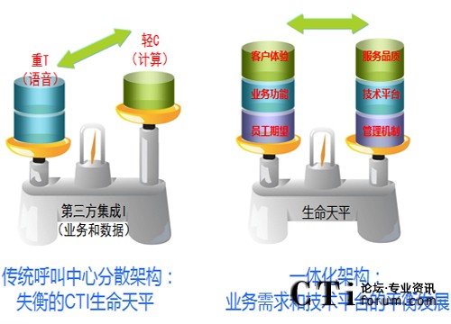 因此很長(zhǎng)一段時(shí)間以來呼叫中心都作為語音通訊的分支之一而存在,而這種定位給呼叫中心的生命力帶來了不平衡的發(fā)展,根源就在于“輕C重T第三方集成I”的格局:語音處理性能和功能強(qiáng)大,計(jì)算能力和數(shù)據(jù)處理弱,因此將業(yè)務(wù)集成和數(shù)據(jù)集成交由第三方承擔(dān)。因此很長(zhǎng)一段時(shí)間,造成呼叫中心在企業(yè)購買之后對(duì)業(yè)務(wù)應(yīng)用的適應(yīng)能力差、業(yè)務(wù)發(fā)展和變化時(shí)系統(tǒng)穩(wěn)定性變的無法保證。