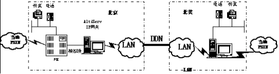 3、系統(tǒng)結構:北京新浪在Nortel交換機與AltiServ網關之間采用模擬線連接,AltiServ通過網卡接入LAN后,再通過數層路由器接入北京與北美的DDN專線。