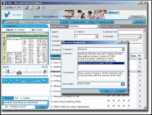 在質(zhì)量管理應(yīng)用模塊中,主管可以通過(guò)表單評(píng)估座席與客戶的交互記錄,分析座席各方面的服務(wù)水平。根據(jù)評(píng)分的結(jié)果,通過(guò)IntelliSeek或評(píng)估報(bào)表(見(jiàn)下節(jié)),可以了解座席的進(jìn)步,或與其他座席的服務(wù)水平進(jìn)行比較。