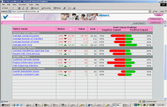 IntelliMiner使用專(zhuān)利的數(shù)據(jù)挖掘技術(shù),自動(dòng)分析導(dǎo)致呼叫中心關(guān)鍵行為指標(biāo)(KPI)和呼叫中心設(shè)定目標(biāo)的因素及其關(guān)系和影響。所分析的數(shù)據(jù)揭示了導(dǎo)致呼叫中心KPI表現(xiàn)的潛在原因,例如過(guò)長(zhǎng)的通話時(shí)間,過(guò)多的轉(zhuǎn)接次數(shù),過(guò)長(zhǎng)的保持時(shí)間,降低生產(chǎn)力和降低客戶滿意度。針對(duì)分析的結(jié)果,用戶可以去回放相關(guān)的呼叫,找到導(dǎo)致這些因素的原因所在。