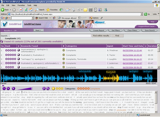 IntelliFind將客戶呼叫轉(zhuǎn)換成可搜索的數(shù)據(jù)庫(kù)形式,根據(jù)業(yè)務(wù)分類(lèi)、短語(yǔ)和關(guān)鍵字鑒別呼叫。IntelliFind使用語(yǔ)音文本轉(zhuǎn)換技術(shù)轉(zhuǎn)換客戶呼叫錄音,幫助用戶理解客戶交互的情況。