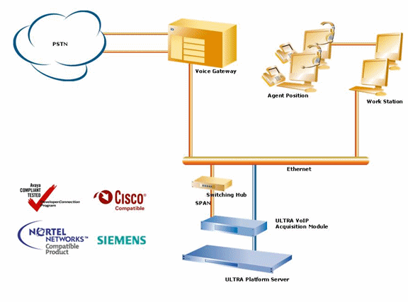 ULTRA通過(guò)VoIP記錄儀來(lái)記錄VoIP呼叫中心環(huán)境中的通話。VoIP記錄儀捕獲相關(guān)語(yǔ)音包并儲(chǔ)存為標(biāo)準(zhǔn)語(yǔ)音文件格式。