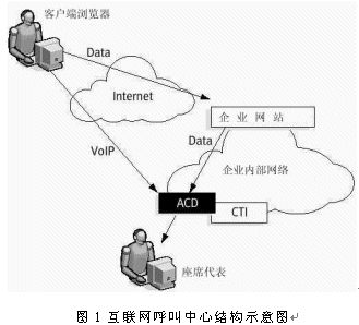 互聯(lián)網(wǎng)呼叫中心是在互聯(lián)網(wǎng)技術(shù)飛速發(fā)展的基礎(chǔ)上所產(chǎn)生的。對于客戶而言,完全的互聯(lián)網(wǎng)呼叫中心和傳統(tǒng)呼叫中心最大的區(qū)別就在于客戶無需電話,只要從一個(gè)Web站點(diǎn)就可以直接進(jìn)入互聯(lián)網(wǎng)呼叫中心。這樣一來,呼叫中心就從傳統(tǒng)形式上的“撥號-交談(Dial to Talk)”發(fā)展到現(xiàn)代形式的“點(diǎn)擊-交談(Click to Talk)”。典型的互聯(lián)網(wǎng)呼叫中心結(jié)構(gòu)如圖1所示。