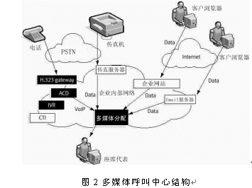 多媒體呼叫中心實(shí)際上是基于CTI技術(shù)的傳統(tǒng)呼叫中心和互聯(lián)網(wǎng)呼叫中心的相互結(jié)合,其接入手段不但有傳統(tǒng)的電話、而且包括了傳真接入、Email接入、Web接入和IP電話接入等。典型的多媒體呼叫中心結(jié)構(gòu)如圖2所示。