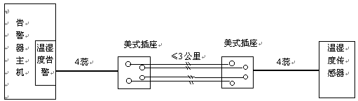 溫、濕度傳感器通過四蕊電話線與告警器主機相連。兩者距離很近時,將傳感器接線插入主機溫、濕度告警接口即可。若距離不夠長時,可按上圖一對一的加長連線,連線距離可達3公里。