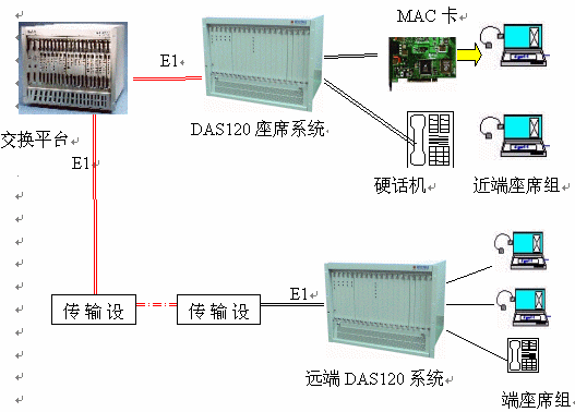 DAS120交換平臺(tái)采用1-4個(gè)E1連接,可以簡(jiǎn)潔實(shí)現(xiàn)PCM信號(hào)轉(zhuǎn)模擬信號(hào)引出到座席。E1接口的信令可選配為隨路信令CAS和透明通道Clear Channel。E1可通過光端機(jī)、微波、HDSL等設(shè)備來傳輸,從而實(shí)現(xiàn)分布式組網(wǎng)。