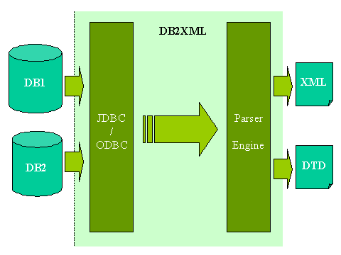 DB2XML中通過JDBC或JDBC-ODBC橋接各種現(xiàn)存的數(shù)據(jù)庫,訪問數(shù)據(jù)庫中的表;通過XML parser構(gòu)造出代表數(shù)據(jù)庫內(nèi)容的XML文件。DTD文件描述了從數(shù)據(jù)庫中的表到XML文件的對(duì)應(yīng)關(guān)系。上圖描述了DB2XML的輸入輸出關(guān)系。事實(shí)上DB2XML是按照以下步驟完成轉(zhuǎn)化工作的:
