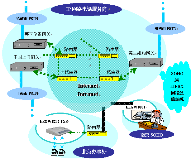 目前,在全球各地蓬勃發(fā)展起一項(xiàng)新興行業(yè)——IP網(wǎng)絡(luò)電話服務(wù)商,他們利用遍布全球、資源豐富的Internet / Intranet網(wǎng)絡(luò),組織自己的IP電話核心網(wǎng)絡(luò),將該網(wǎng)絡(luò)的服務(wù)開(kāi)放給各地的公眾。其核心網(wǎng)絡(luò)的網(wǎng)關(guān)完全遵照ITU-T H.323標(biāo)準(zhǔn),可以解決電話號(hào)碼與IP地址的映射,IP地址解析,路由尋路等問(wèn)題。能夠?qū)崿F(xiàn)SOHO族通過(guò)該網(wǎng)絡(luò)接入全球各地的市話。
