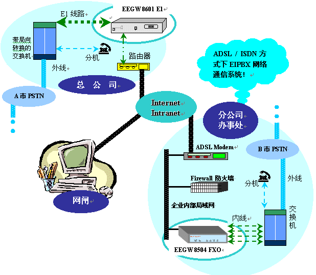 為實(shí)現(xiàn)地理位置分散的各企業(yè)分支機(jī)構(gòu)間的語(yǔ)音通信,節(jié)約企業(yè)內(nèi)部的通信成本和管理成本,許多公司在選擇ADSL或ISDN等其他寬帶接入技術(shù)接入Internet,同時(shí)希望利用該網(wǎng)絡(luò)建立內(nèi)部的EIPBX網(wǎng)絡(luò)通信系統(tǒng)。