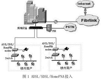 中電飛華在光纖(或其他專(zhuān)線)接入的基礎(chǔ)上提供樓宇、小區(qū)的整體接入解決方案,即在光纖接入到樓宇和小區(qū)之后,通過(guò)各種接入手段將樓內(nèi)商業(yè)用戶(hù)、小區(qū)個(gè)人用戶(hù)等接入Internet。根據(jù)樓內(nèi)/間布線情況采用不同的接入方法,包括ADSL、SDSL、HomePNA接入以及以太網(wǎng)接入等。