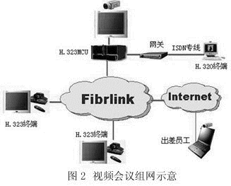 目前視頻會(huì)議系統(tǒng)主要有兩大類(lèi):一種基于H.320協(xié)議標(biāo)準(zhǔn),另一種基于H.323協(xié)議標(biāo)準(zhǔn)。H.320會(huì)議系統(tǒng)技術(shù)成熟,運(yùn)行穩(wěn)定,圖像質(zhì)量高,但業(yè)務(wù)功能單一,組網(wǎng)不夠靈活;H.323會(huì)議系統(tǒng)是最近兩年興起的視頻會(huì)議系統(tǒng),運(yùn)行在廣泛存在的IP網(wǎng)絡(luò)之上,以功能豐富、組網(wǎng)方便靈活等為主要特征,成為視頻會(huì)議系統(tǒng)的發(fā)展方向,但其視頻質(zhì)量很大程度上依賴(lài)于所承載的IP網(wǎng)絡(luò)的質(zhì)量。中電飛華公司基于FibrLINK平臺(tái),為用戶(hù)提供H.320、H.323以及H.320和H.323混合組網(wǎng)的視頻會(huì)議系統(tǒng)建設(shè),如圖2所示。