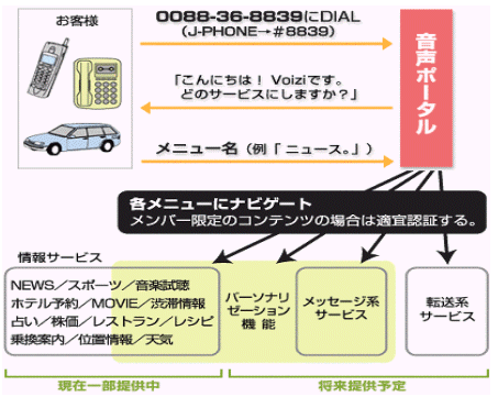 首先撥星號(hào)*(0088-36-8839,J-PHONE是#8839),接通后則是VOIZI主菜單,在電話員小姐的導(dǎo)播之后您可說出您希望的菜單,即可連接。之后再根據(jù)導(dǎo)播說出自己的希望,繼續(xù)進(jìn)行使用。
