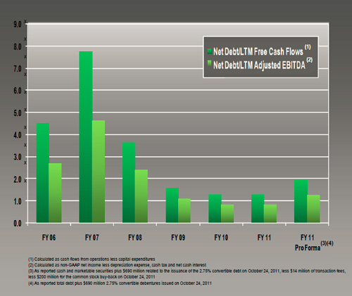 截至2011年9月30日,公司總計持有債務(wù)8.874億美元。其中1.45億美元短期貸款(term loans)2013年3月到期,4.92億美元2016年3月到期,此外還有2.5億美元的可轉(zhuǎn)債。2011年10月24日,公司繼續(xù)發(fā)行價值6.9億美元的可轉(zhuǎn)債,利率為2.75%,2031年11月1日到期。