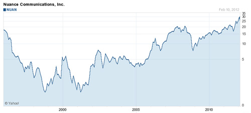 截至美東時間2012年2月10日收盤,Nuance收報26.49美元,當(dāng)前市值80億美元,TTM市盈率高達(dá)218倍。最近半年股價累計漲幅達(dá)47%,并于今年年初創(chuàng)下了31美元的新高。