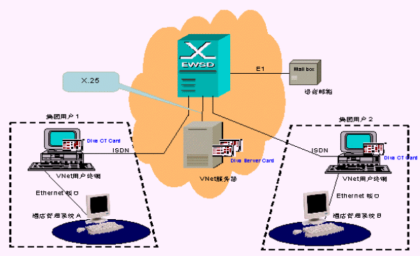 圖中集團(tuán)用戶(hù)1與集團(tuán)用戶(hù)2內(nèi)部使用了配置Eicon 公司Diva CT Card的Vnet系統(tǒng)用戶(hù)終端,同時(shí)接入ISDN設(shè)備與EWSD交換機(jī)連接,信號(hào)通過(guò)EWSD交換機(jī)響應(yīng)給配置Eicon