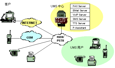 客戶用電子郵件、語(yǔ)音、尋呼、移動(dòng)短消息、傳真等與UMS用戶聯(lián)系,UMS中心啟動(dòng)相應(yīng)的服務(wù)與客戶建立連接,將客戶所發(fā)信息按識(shí)別標(biāo)識(shí)直接轉(zhuǎn)發(fā)到UMS用戶或中繼服務(wù)器,若因UMS用戶不在等原因,無(wú)法直接聯(lián)系,系統(tǒng)會(huì)提示客戶選擇別的方式聯(lián)系。也可將其存儲(chǔ),并進(jìn)行必要的格式轉(zhuǎn)換與管理,這時(shí)UMS中心可以主動(dòng)呼叫UMS用戶的手機(jī),傳真機(jī),電話等主動(dòng)將信息送到,UMS用戶也可以在任何時(shí)間、任何地點(diǎn),從固定電話網(wǎng)(普通電話、傳真機(jī)、IC卡電話等)、移動(dòng)網(wǎng)(GSM、模擬、CDMA、WAP手機(jī)、掌上電腦、PDA等)、尋呼網(wǎng)、互聯(lián)網(wǎng)(PC)訪問(wèn)中心服務(wù)器查詢,索取個(gè)人信息。
