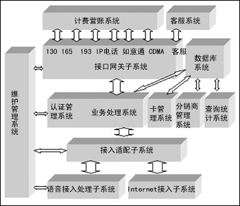 綜合付費平臺的軟件邏輯結構分為語音接入處理子系統(tǒng)、Internet 接入子系統(tǒng)、接入適配網(wǎng)關子系統(tǒng)、認證管理子系統(tǒng)、業(yè)務處理系統(tǒng)、卡管理系統(tǒng)、分銷商管理系統(tǒng)、查詢統(tǒng)計系統(tǒng)、數(shù)據(jù)庫系統(tǒng)、接口網(wǎng)關子系統(tǒng)和維護管理子系統(tǒng)。