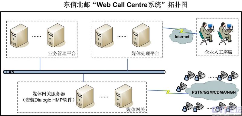 隨著中國經濟的快速發(fā)展,越來越多的企業(yè)尤其是中小企業(yè)對呼叫中心的需求量越來越大,需求質量也越來越高。由于呼叫中心建設涉及技術十分專業(yè)、涉及領域也比較廣泛、必須投入巨大的資金購買軟硬件設備,并且需要大量的維護力量,因此對于中小企業(yè),尤其是缺乏專業(yè)技術力量和資金的中小企業(yè)來說,建設自有的呼叫中心顯得不切實際。正是基于這種情況,EB開始與Dialogic合作,采用其HMP系統(tǒng)軟件,以IP技術為基礎,依托電信網絡,建設呼叫中心系統(tǒng),以托管方式為客戶提供呼叫中心服務,即Web Call Centre服務。