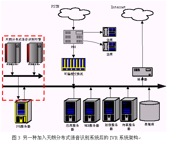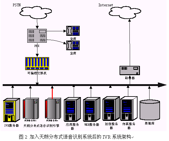 硬件連接:天朗分布式語音識別系統(tǒng)是通過局域網(wǎng)來把客戶端和服務(wù)器連在一起。因此在硬件上把天朗分布式語音識別系統(tǒng)聯(lián)入到IVR的一種簡單的辦法是把引擎的所有服務(wù)器接入到系統(tǒng)現(xiàn)有的局域網(wǎng)中,使得識別服務(wù)器能和IVR服務(wù)器通過TCP/IP通訊即可。連接后的系統(tǒng)架構(gòu)可以用圖2來表示。