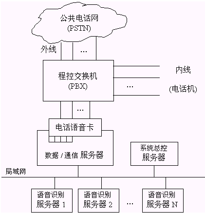 (4)應(yīng)用層軟件:安裝在數(shù)據(jù)/通信服務(wù)器上,負(fù)責(zé)與交換機(jī)和總控程序進(jìn)行交互。它根據(jù)識(shí)別結(jié)果向交換機(jī)發(fā)送電話轉(zhuǎn)接指令(例如DTMF鍵碼)。