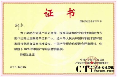 CTI論壇(ctiforum)11月26日消息(記者 潘婷):2009年11月7日,得意公司董事長鄭方博士獲中國產(chǎn)學(xué)研合作促進(jìn)會2009年度中國產(chǎn)學(xué)研合作創(chuàng)新獎。該獎勵是面向國內(nèi)在促進(jìn)產(chǎn)學(xué)研合作及創(chuàng)新方面做出突出貢獻(xiàn)的單位及個人所頒發(fā)的年度榮譽(yù)獎。