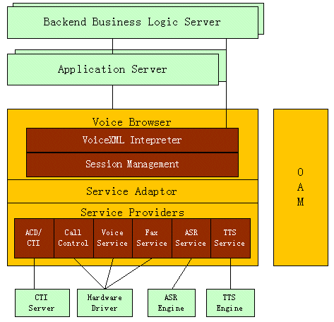 用于存放和產(chǎn)生VoiceXML腳本,可以是文件系統(tǒng)或WEB服務器,一般文件系統(tǒng)應用于靜態(tài)腳本,WEB服務器應用于動態(tài)腳本;應用邏輯組件或中間件,進行事務處理。