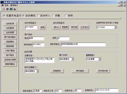 客戶打入電話后,當(dāng)系統(tǒng)的自動(dòng)語音應(yīng)答子系統(tǒng)無法解決客戶問題時(shí),客戶可選擇人工服務(wù),由鐵路客戶服務(wù)代表直接接聽客戶電話,處理并解決客戶問題。此時(shí)客戶同座席話務(wù)人員直接溝通,并同時(shí)記錄下該客戶的聯(lián)系方式,將相關(guān)數(shù)據(jù)添加入系統(tǒng)數(shù)據(jù)庫;也可以在數(shù)據(jù)庫的支持下回答國家和地方的鐵路信息及相關(guān)規(guī)定等的咨詢和疑問?蛻粢部梢赃x擇自動(dòng)語音服務(wù)方式,根據(jù)系統(tǒng)的語音提示輸入按鍵,選擇類別,將自己的投訴和建議以及自己的聯(lián)系方式信息以留言錄音的方式保存在系統(tǒng)中。系統(tǒng)同時(shí)還支持自動(dòng)傳真方式,客戶可以通過傳真機(jī)進(jìn)入本系統(tǒng),通過按鍵選擇傳真方式,將自己的意見建議等的文本內(nèi)容傳真給系統(tǒng),系統(tǒng)自動(dòng)接受并存入數(shù)據(jù)庫。