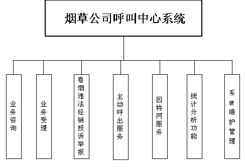 卷煙經(jīng)銷戶等客戶利用電話、傳真、電子郵件、因特網(wǎng)、手機(jī)、短消息等撥打統(tǒng)一的特服號(hào)碼(如800XXX或9XXXX)進(jìn)入煙草公司呼叫中心,本系統(tǒng)依托煙草公司各類業(yè)務(wù)技術(shù)支持系統(tǒng)和網(wǎng)絡(luò)系統(tǒng),實(shí)現(xiàn)煙草專賣局原有管理系統(tǒng)/業(yè)務(wù)系統(tǒng)及數(shù)據(jù)庫(kù)的無縫連接,通過人工受理或自動(dòng)語(yǔ)音服務(wù)等方式全天24小時(shí)不間斷地為客戶提供各種服務(wù)。