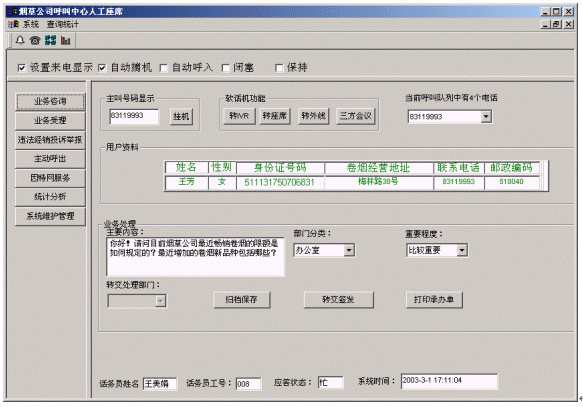 煙草公司呼叫中心將接入功能、導(dǎo)航功能、自動(dòng)語(yǔ)音查詢功能、人工座席服務(wù)功能、話路轉(zhuǎn)接功能、信息資料處理緊密聯(lián)系起來。用戶撥打特服電話號(hào)碼后,可以根據(jù)需要選擇人工服務(wù)、自動(dòng)語(yǔ)音查詢、自動(dòng)留言,并能夠在幾種服務(wù)中來回切換或轉(zhuǎn)接其它電話;所記錄的資料可以分門別類的進(jìn)行統(tǒng)計(jì)并形成報(bào)表,供相關(guān)部門進(jìn)行檢索查閱;意見處理完畢,可由座席主動(dòng)呼叫用戶,告知處理意見,形成閉環(huán)處理流程。