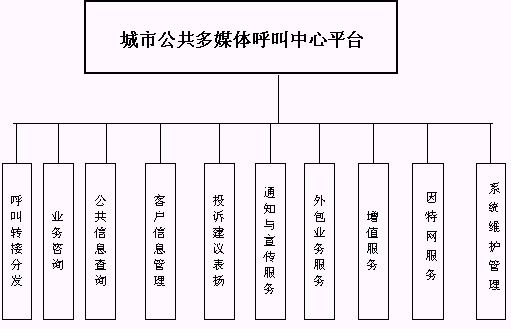 客戶利用電話、傳真、電子郵件、因特網(wǎng)、手機、短消息等進入城市公共多媒體呼叫中心平臺,本系統(tǒng)依托現(xiàn)有各專業(yè)呼叫中心/使用城市公共多媒體呼叫中心平臺租賃服務的企事業(yè)單位的各類業(yè)務技術支持系統(tǒng)和網(wǎng)絡系統(tǒng),通過人工受理或自動語音服務等方式全天24小時不間斷地為客戶提供各種服務。