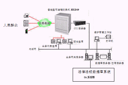 該系統(tǒng)的設(shè)計采用先進的三層CLIENT/SERVER網(wǎng)絡(luò)體系結(jié)構(gòu),集目前先進的計算機技術(shù)、通信技術(shù)、計算機電信集成(CTI)技術(shù)、多媒體呼叫接入技術(shù)、智能接入交換分配技術(shù)、數(shù)字語音處理技術(shù)、異構(gòu)系統(tǒng)信息交互技術(shù)、INTERNET網(wǎng)絡(luò)技術(shù)、安全容錯技術(shù)、網(wǎng)絡(luò)組網(wǎng)技術(shù)等于一體,并與地級市司法行政部門/法院已有技術(shù)支持系統(tǒng)(如MIS系統(tǒng)、法律法規(guī)數(shù)據(jù)庫系統(tǒng)等)緊密結(jié)合在一起,突破時空的限制,通過人工座席、自動語音/傳真、司法部門相關(guān)人員等為群眾提供電話、傳真、手機等多種服務(wù)形式的周到、快捷、全方位的法律服務(wù),為人民群眾與地級市司法行政部門/法院之間架起一座密切聯(lián)系的橋梁。