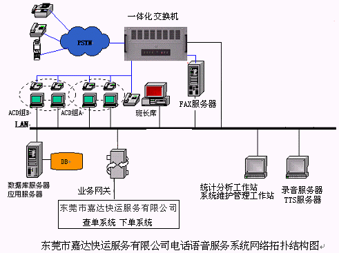 48個(gè)人工座席,落單組為30個(gè)人工座席(其中1個(gè)為落單組班長座席),查詢組為18個(gè)人工座席(其中1個(gè)為查詢組班長座席),48路全程同步錄音(可以實(shí)時(shí)設(shè)置或取消),64路IVR, 24路TTS通道,4路傳真,64條模擬中繼線路接入,支持普通話、廣東話等多語種服務(wù)的語音合成(TTS);提供各種話音、傳真集成服務(wù),提供辦公時(shí)間服務(wù)流程與非辦公時(shí)間服務(wù)流程,人工服務(wù)落單,自助落單,貨物在途狀況人工服務(wù)查詢,貨物在途狀況自助查詢,業(yè)務(wù)咨詢,語音信箱,傳真服務(wù)等業(yè)務(wù)功能,實(shí)現(xiàn)與后臺(tái)下單系統(tǒng),貨物在途狀況查詢系統(tǒng),GPS系統(tǒng)等的無縫集成,為客戶提供24小時(shí)全天候的快捷優(yōu)質(zhì)服務(wù)。