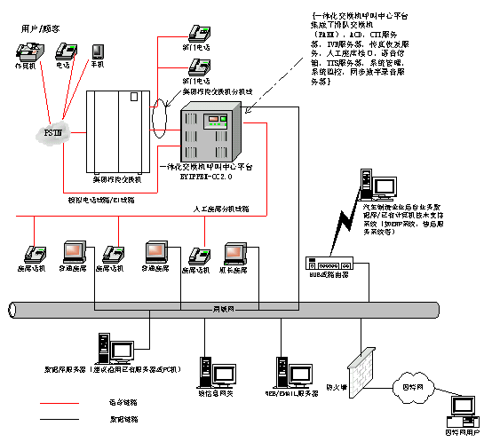 基于一體化交換機(jī)的汽車制造企業(yè)多媒體客戶服務(wù)中心系統(tǒng)產(chǎn)品BYQCZZ-CC2.0的網(wǎng)絡(luò)拓?fù)浣Y(jié)構(gòu)如下: